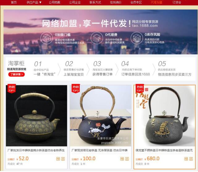 在这些都确定没有任何问题后,然后在看店铺导航里是否有“代理加盟”这一项,这是最为重要的!因为有的供应商只是要你下载数据包就没了,店铺的具体相关介绍都没有很多的了解!这样的供应商就不用去看了!因为这样的为这样的供应商代理会出现很多的问题,比如运费问题,退换货问题,运费怎么算,由谁来出?发货时间?什么快递?偏远地区怎么处理?等等。如果是什么都不说清楚就可以直接代理的,大家就可以不用看了!