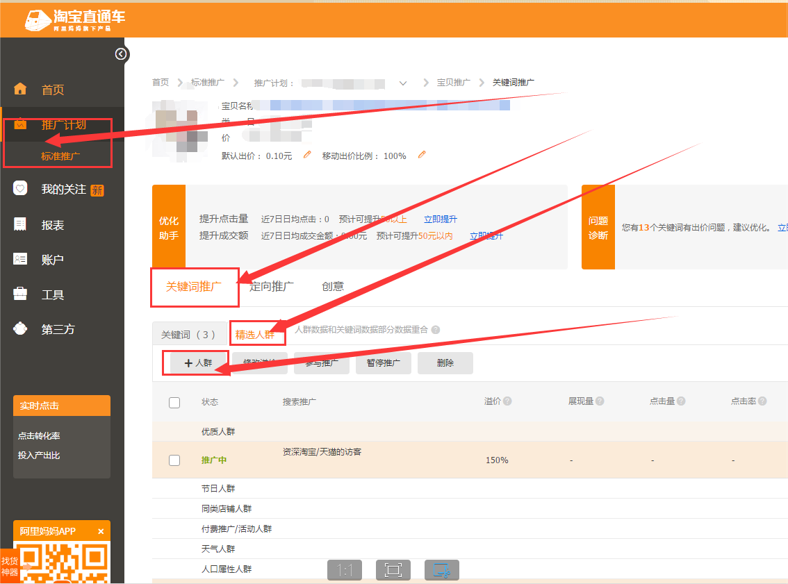2.关键词推广下面精选人群,添加人群。添加访客人群,选择人口属性人群,根据上面自己生意参谋的访客分析来设置类目比单价,性别,年龄和月均消费额度。调整溢价,保留30%利润自己调整相应的溢价。