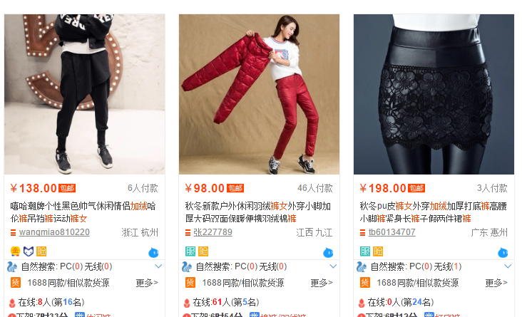 很明显,是左边第二张,因为消费者搜索的是“加绒裤女”,他希望看到的是一条加绒的裤子,虽然以上三个产品标题都有“加绒”,但是只有左边第二张主图展示了加绒,其他三张只是简单的展示产品的款式,很明显不符合消费者第一需求。